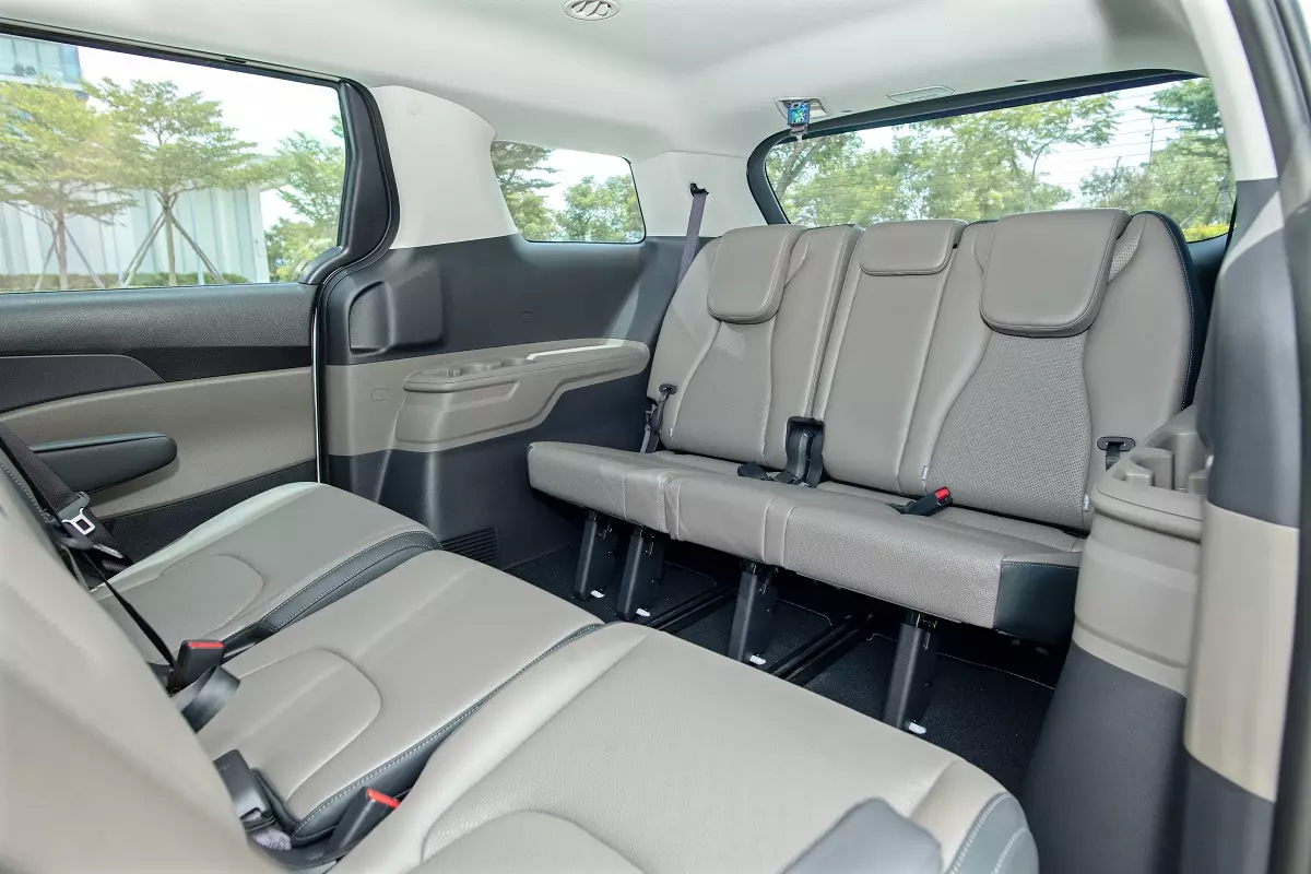 Không gian để chân và khoảng sáng trần Carnival rộng rãi ở cả ba hàng ghế. Khi gập phẳng hàng ghế thứ ba và tháo rời hàng ghế thứ hai, Carnival sẽ có không gian chứa đồ đạt lần lượt 1.139 lít và 4.110 lít - những con số lớn hơn bất kỳ mẫu xe MPV nào hiện có mặt trên thị trường.