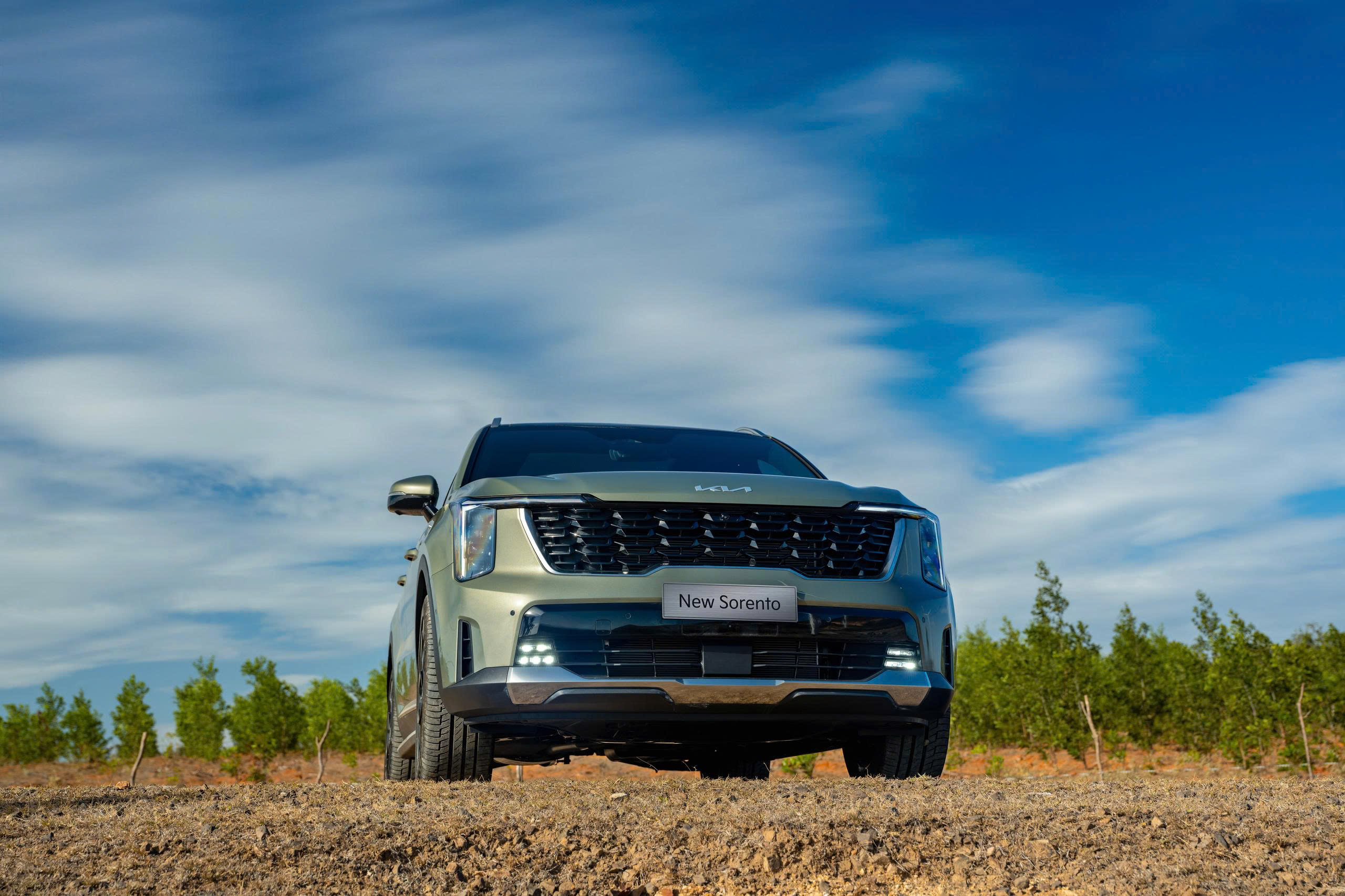 Đầu xe KIA Sorento nổi bật với lưới tản nhiệt hình mũi hổ đặc trưng kết hợp cụm đèn pha dạng mắt hổ thiết kế mới